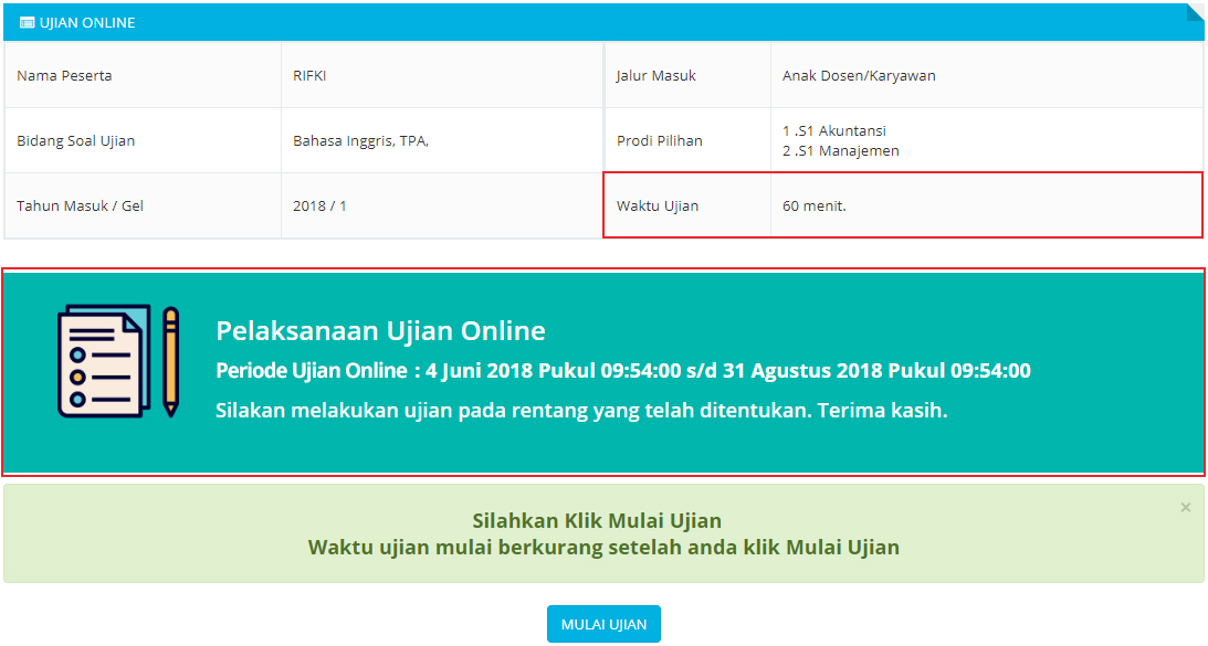 Maka calon mahasiswa memulai ujian di tanggal dan durasi waktu yang telah ditentukan. Jika sudah memulai ujian, waktu ujian online