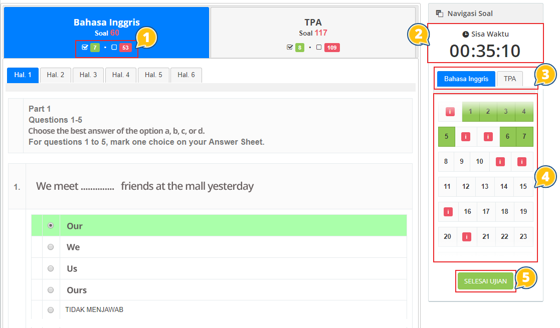 No. 3 Navigasi bidang soal,untuk membantu peserta ujian memeriksa soal yang belum dijawab berdasarkan bidang soal, misal Bahasa Inggris / TPA